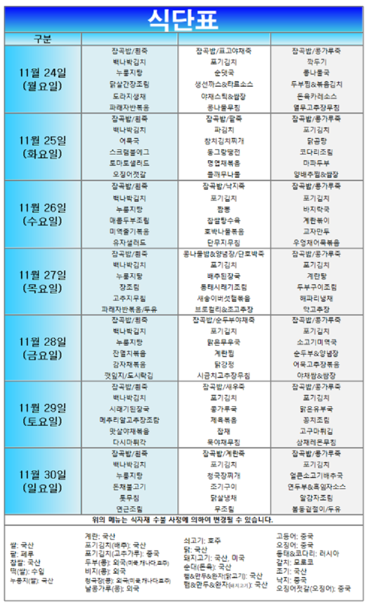 (2025³â) 11¿ù 24ÀÏ~ 11¿ù 30ÀÏ ÁÖ°£½Ä´ÜÇ¥