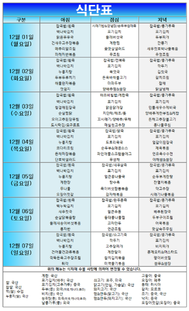 (2025³â) 12¿ù 01ÀÏ~ 12¿ù 07ÀÏ ÁÖ°£½Ä´ÜÇ¥